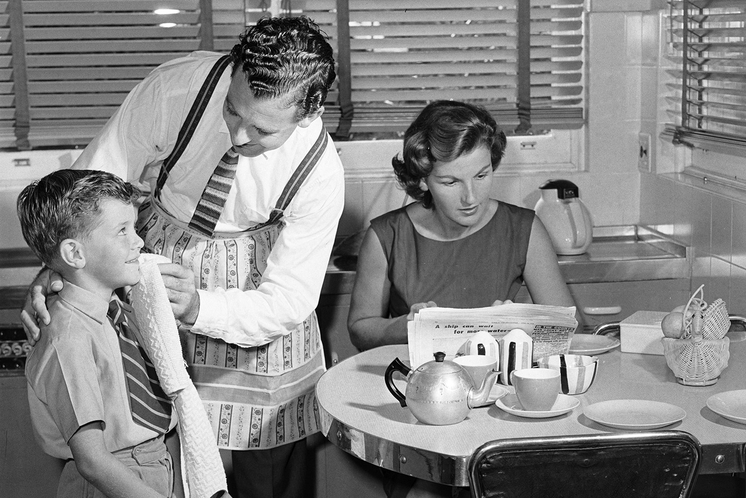 Another image, by frequent PIX contributor Cec Lynch, in a series from 1958 about equal pay for women, shows a family of three at breakfast time, the mother sitting at table and absorbed in what we assume to be the financial pages, while the father, standing by the kitchen bench and sporting an apron, bends over to wipe the remains of breakfast from his son’s chin. All three models look profoundly awkward, as if uncertain whether they have been cast in a straight drama or a comedy.