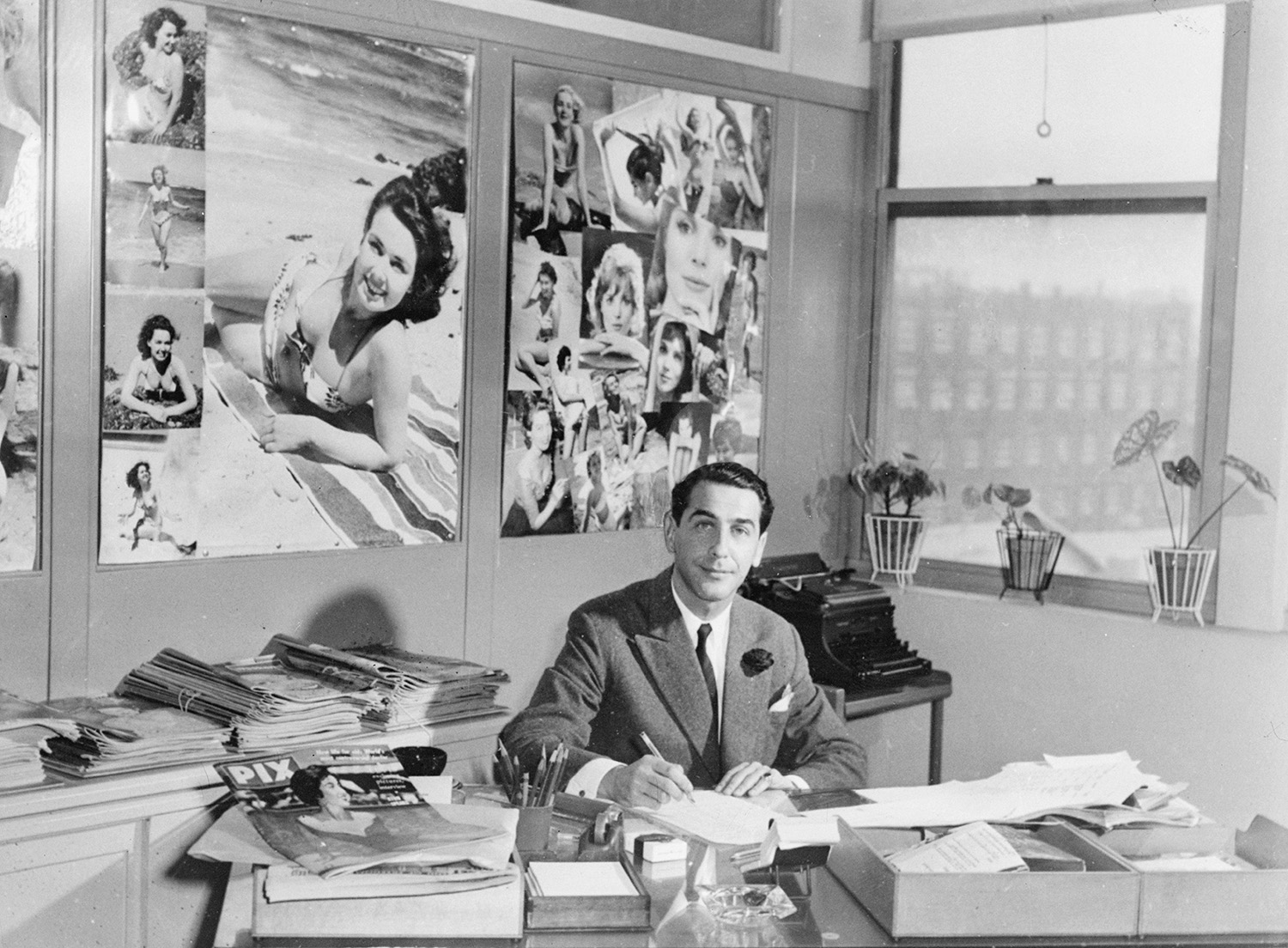 This high-minded appeal to the human impulse to study, examine and learn would have been interpreted by many subscribers to refer to the signature images of women sunbathing, or caught mid pirouette or plié, that were an essential component of every issue of the magazine. A splendidly staged photograph of the editor of PIX, taken in 1959, makes the deliberateness of this more down-to-earth appeal very clear. The editor, positioned importantly behind his desk, is himself caught mid-flight, in the act of signing an important-looking document, while fixed to the wall behind him are two larger than life collages of young women staring invitingly at the camera.