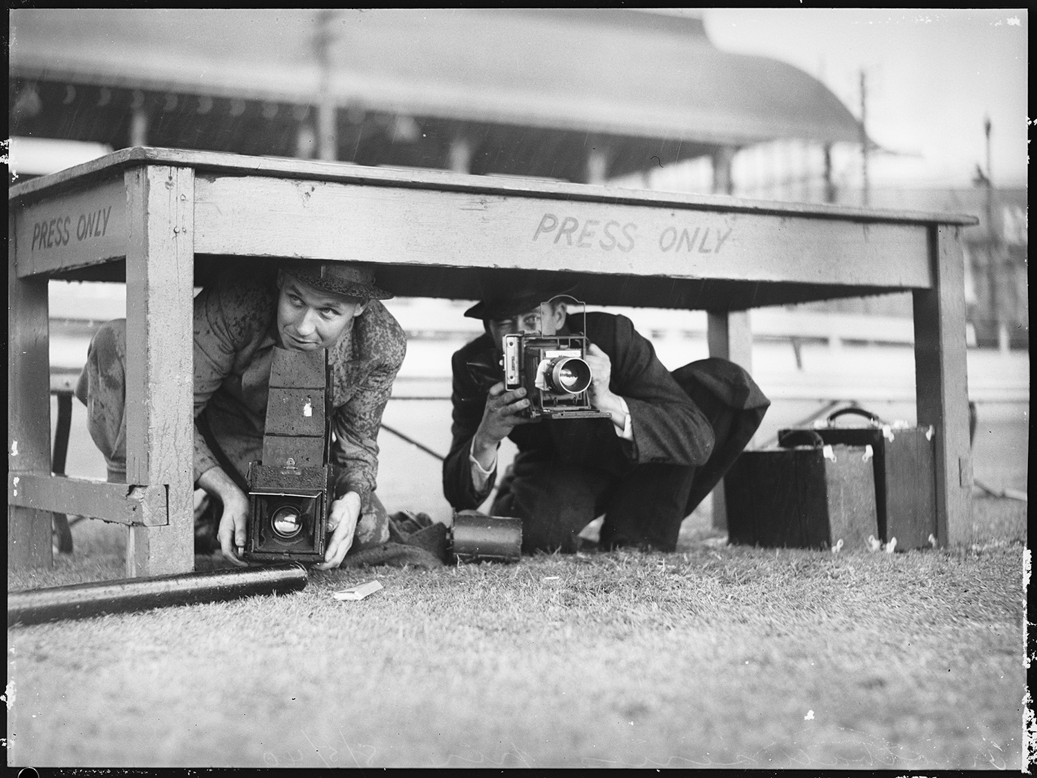 Ray Olson’s photo of fellow press photographers sheltering from the rain at a football match in 1940. State Library of NSW