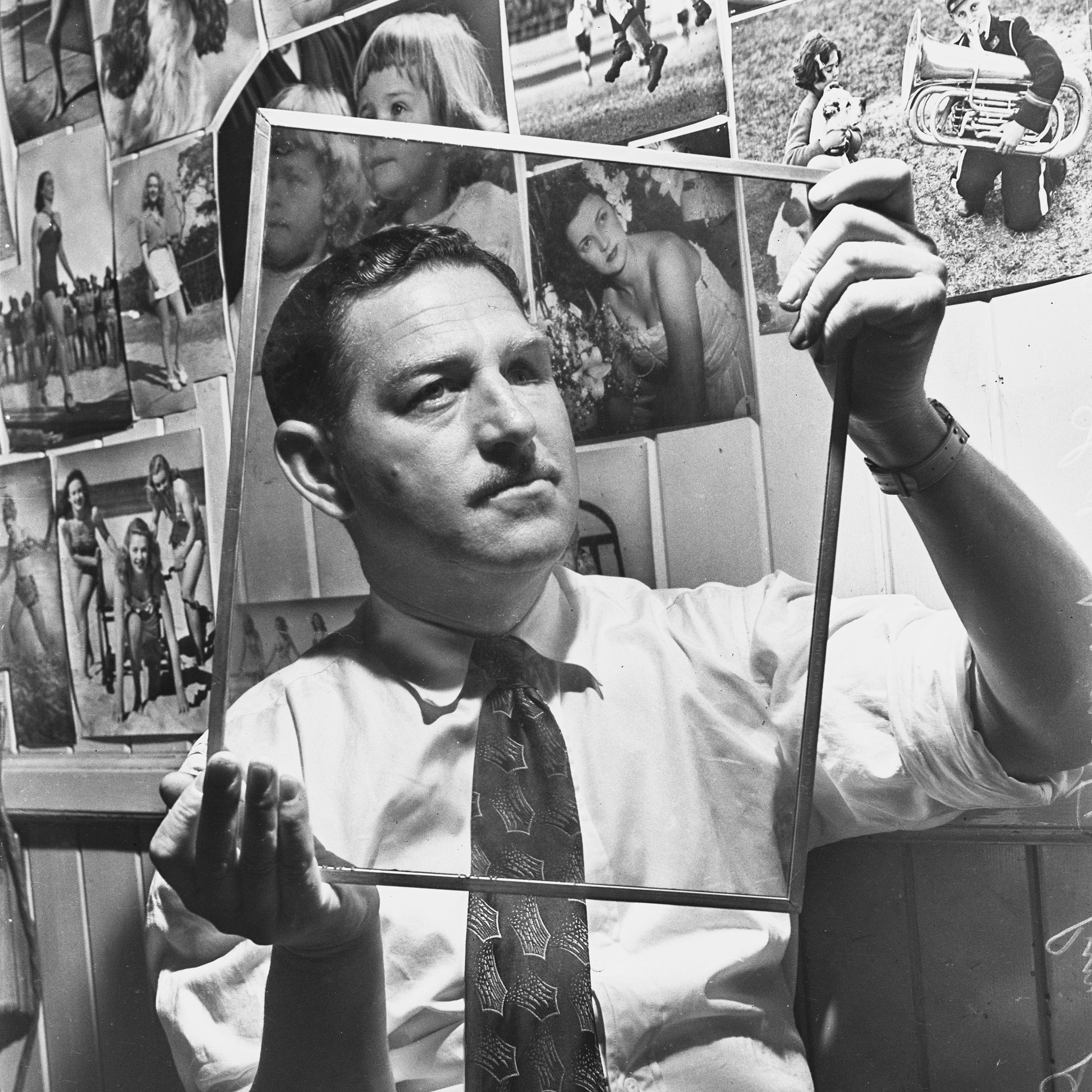 This high-minded appeal to the human impulse to study, examine and learn would have been interpreted by many subscribers to refer to the signature images of women sunbathing, or caught mid pirouette or plié, that were an essential component of every issue of the magazine. A splendidly staged photograph of the editor of PIX, taken in 1959, makes the deliberateness of this more down-to-earth appeal very clear. The editor, positioned importantly behind his desk, is himself caught mid-flight, in the act of signing an important-looking document, while fixed to the wall behind him are two larger than life collages of young women staring invitingly at the camera.