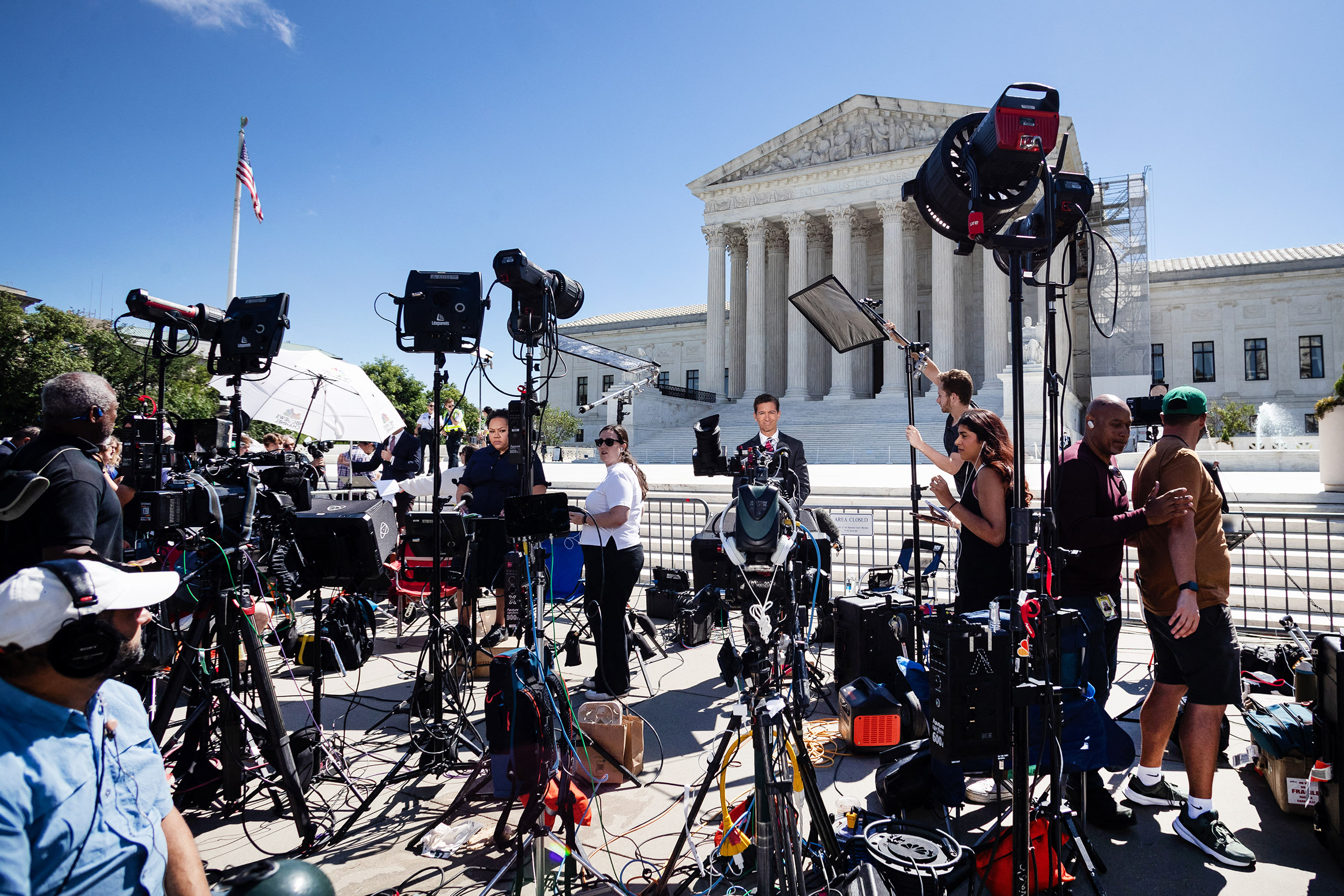 Who’s keeping the gate? News outlets outside the US Supreme Court on 1 July 2024, the day the court released the presidential immunity ruling that “effectively creates a law-free zone around the president” according to one of the judges. Allison Bailey/Middle East Images via AFP