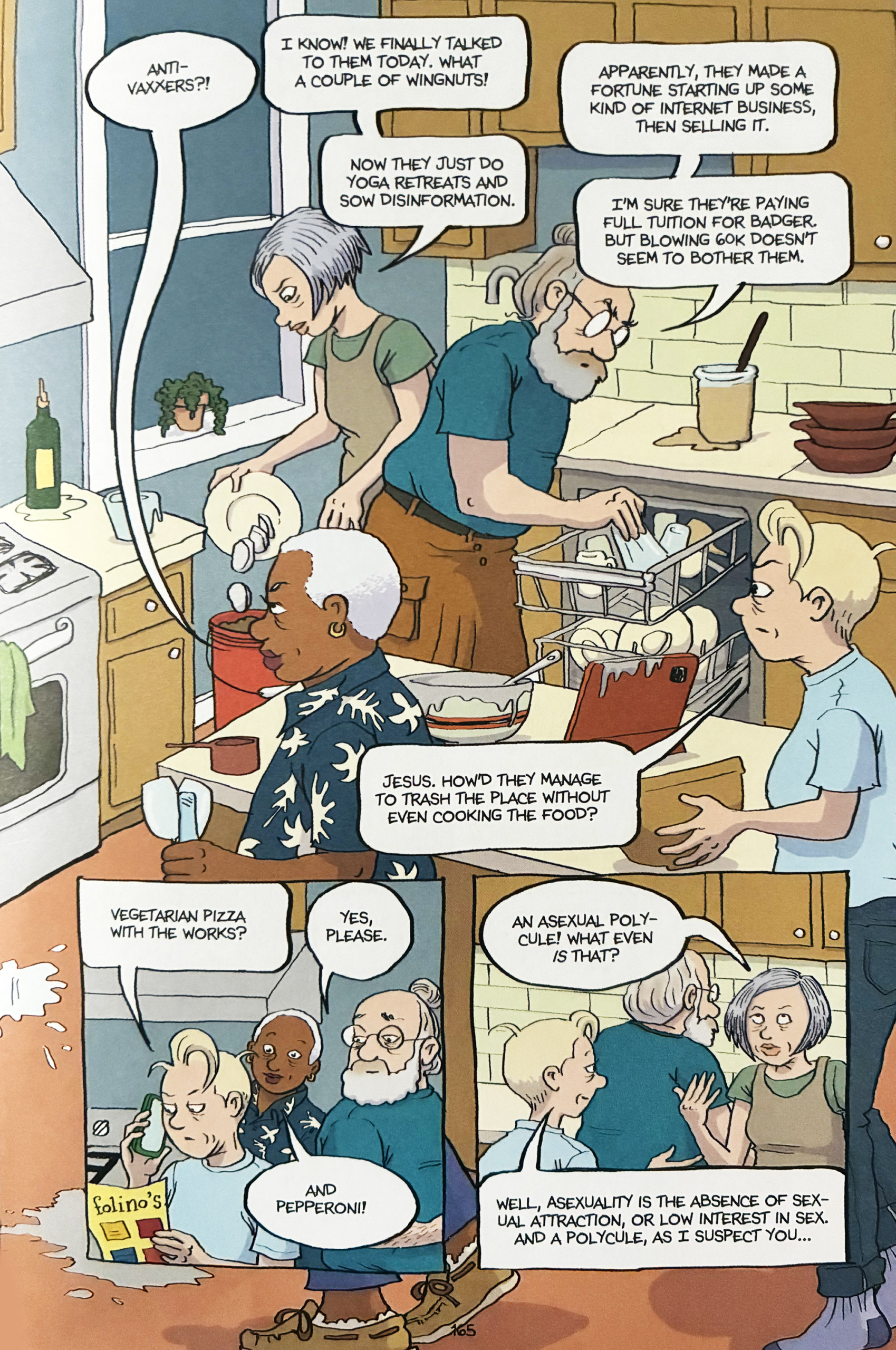 A crucial plot point is the appearance of STUART and SPARROW’s daughter, JAIO-RAIZEL, whose birth was movingly shown in Dykes back in 2003. Understandably, JAIO-RAIZEL, whose part-Chinese part-Jewish heritage is signalled in her unusual name, now styles herself (possibly “themself”) JR. She bears a passing resemblance to Greta Thunberg. Along with her friend BADGER, JR arrives home unexpectedly one midnight, just when STUART, SPARROW and NAOMI are heavily into their first night of sixty-something sexual experimentation and rapture — all this shown in scenes requiring Bechdel to draw pictures so forthright that they feel like an invasion of the privacy of the people involved (parental guidance recommended, i.e., completely unsuitable for parents).
