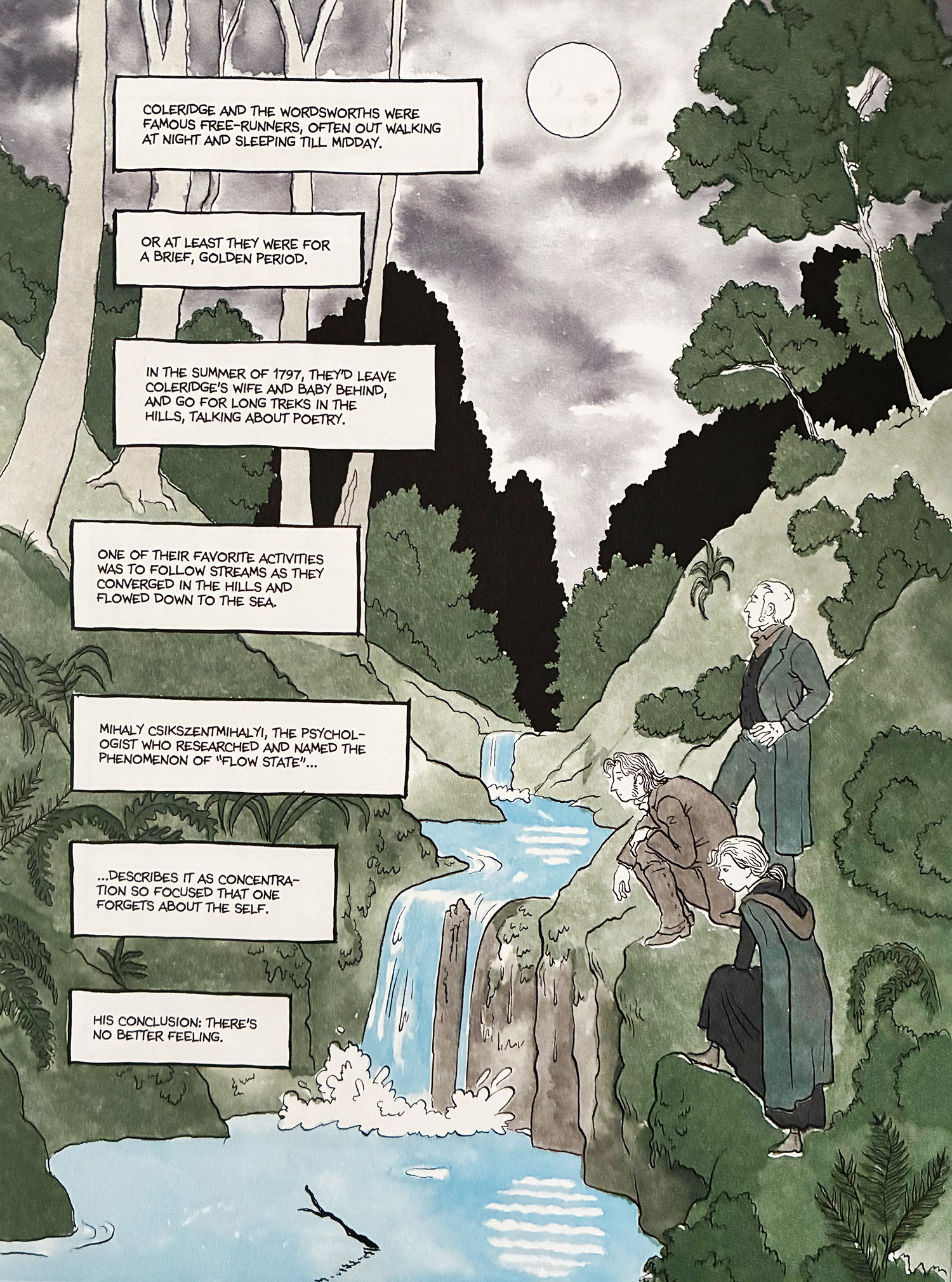 Bechdel draws attention to the persistence of Romantic ideals in the modern and postmodern world and emphasises especially the symbolic and actual challenge represented by mountains. The climax — reminiscent of the episode in The Prelude in which Wordsworth discovers he has crossed the alps without realising it — is Bechdel and Taylor’s failure to match Snyder’s (successful) and Kerouac’s (almost successful) ascent of the 12,000-foot Matterhorn Peak in Yosemite National Park, as told in The Dharma Bums. Once again, for the central character, failure is a via negativa, a form of progression, even when it doesn’t immediately seem to be so.